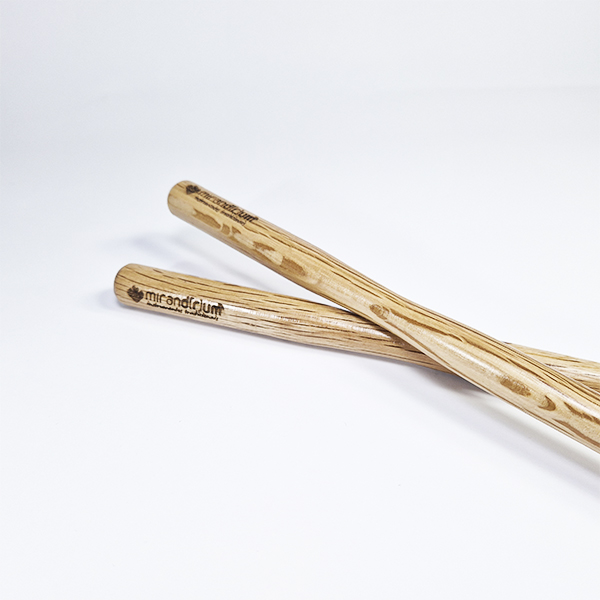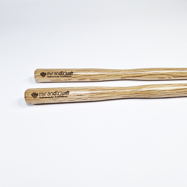 • Pauzinhos de madeira clara com gravação 'miranddrum wooden drumsticks'