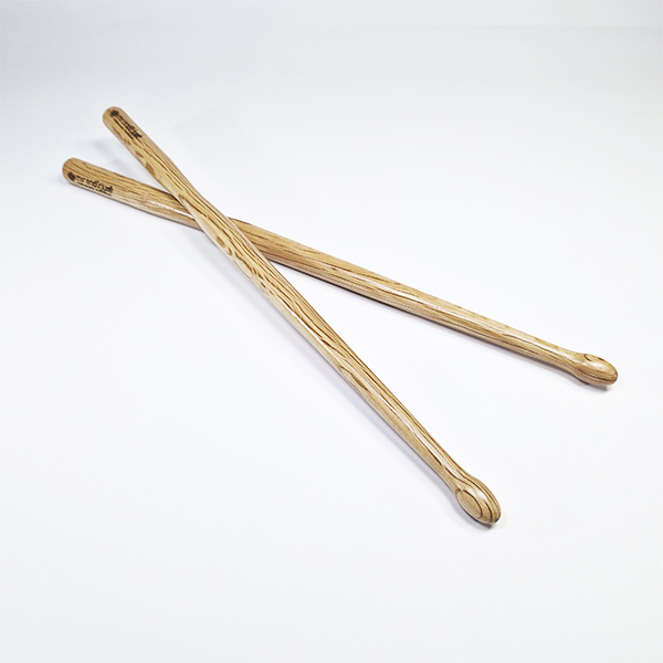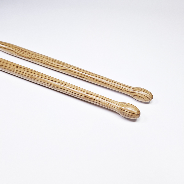 • Par de baquetas de madeira clara com veios visíveis e cabeças arredondadas