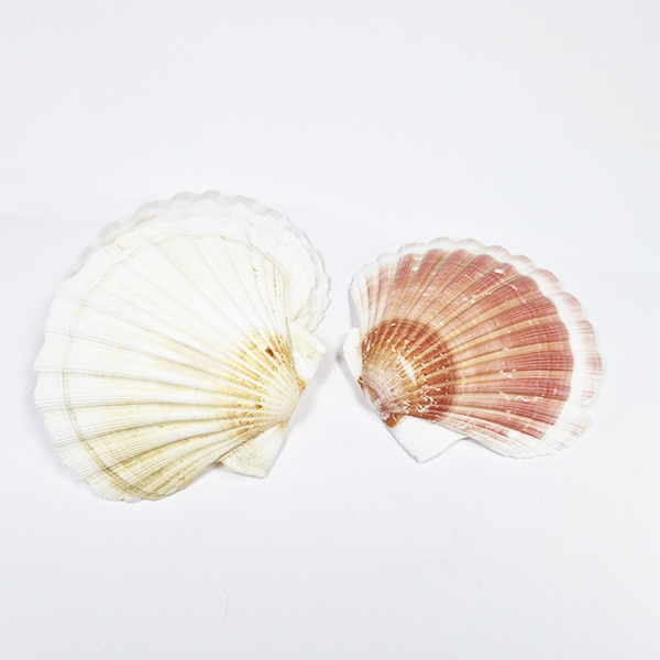 • Duas conchas do mar uma branca/amarelada e outra castanho avermelhada sobre fundo branco